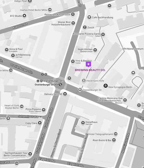 • Linien M1 oder M5 Haltestelle Heckmann-Höfe / Oranienburger Str. Geh etwa 150 m bis zum Tor der Heckmann-Höfe (neben der Neuen Synagoge). Durch den Torbogen gehen — Brewing Beauty Co. befindet sich im ersten Hof.